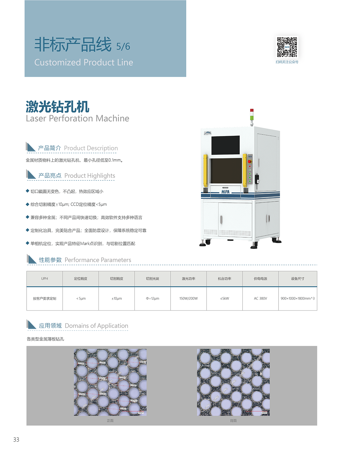 金屬材質物料上的激光鉆孔機,最小孔徑低至0.1mm。