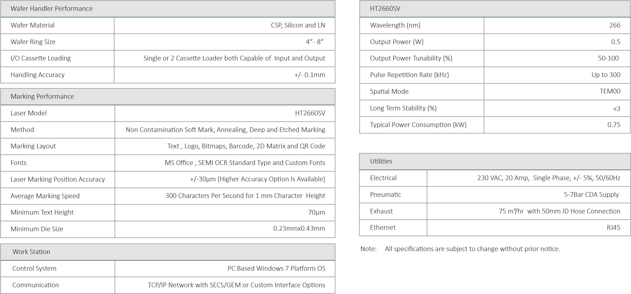 As the industry advances toward miniaturization and new materials composite on the wafer, the demand for wafer and individual die marking for traceability and identification has increased in the recent years. Capitalizing on our scanvision capability and laser knowledge, Hylax direct wafer die marking system is a fully automatic system designed for direct marking of dies in post sawn wafer form in wafer rings and capable of processing up to 12” wafer size.