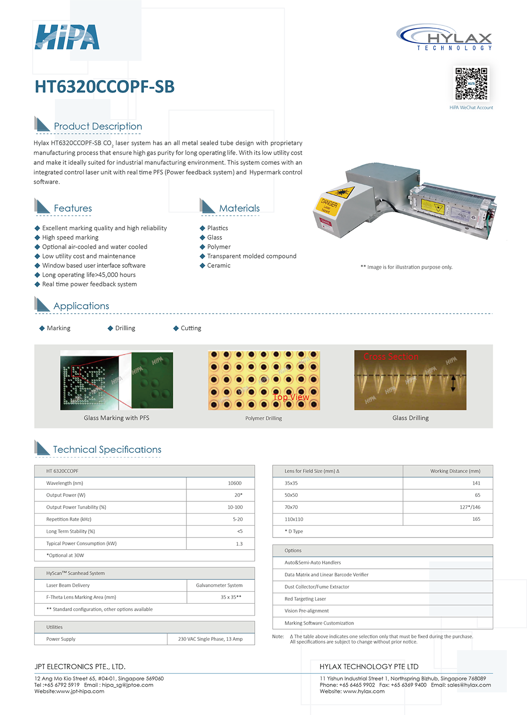 Hylax HT6320CCOPF-SB CO2 laser system has an all metal sealed tube design with proprietary manufacturing process that ensure high gas purity for long operating life. With its low utility cost and make it ideally suited for industrial manufacturing environment. This system comes with an integrated control laser unit with real time PFS (Power feedback system) and Hypermark control software.